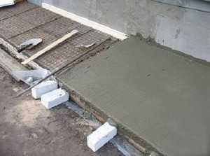 - Бетонное основание – заливка из бетонной смеси, формованная под размер и уклон отмостки. В нижней части, для придания большей прочности данной прослойке, помещают металлический сетчатый каркас из арматуры. В простом варианте этот слой может быть конечным;