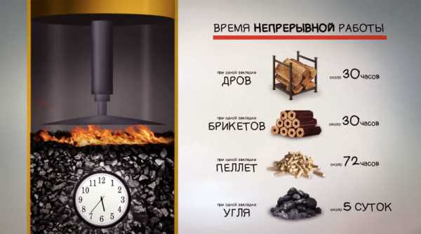 В результате такой работы отопительного устройства для полного сгорания одной загрузки дров требуется от 7 часов. В моделях с самыми большими объемами камеры сгорания для сжигания одной загрузки топлива может понадобиться до 36 часов.