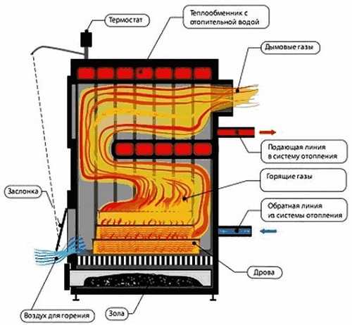 По сути, традиционный твердотопливный котел работает как обычная печка. Здесь также есть топка, в которой горят дрова (уголь, пеллеты и другие виды твердого топлива). Выделяемая энергия нагревает теплоноситель, расположенный в емкости над камерой сгорания.