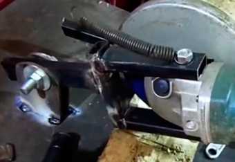 - Чтобы маятник с болгаркой произвольно не опускался, предусматривают возвратную пружину. Она должна действовать на растяжение и быть очень упругой. Пружину фиксируют петлями, приваренными к станине и маятнику.