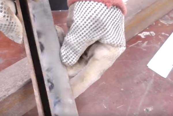 Второе пиление производится в продольном направлении. Вырезается угол, чтобы металлическое покрытие легло полностью на стол.