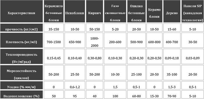 Приведем сводную таблицу свойств каждого материала: