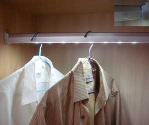 Важно, чтобы освещение распространялось именно на вещи, что находятся внутри. При правильной организации света, вы без проблем и очень быстро сможете найти то, что искали. Для угловых гардеробов можно установить светотехнику на прищепках. За счет держателей, светильник можно устроить в любом положении. К тому же прищепки имеют большой плюс – дополнительное приспособление, которые будет выключать лампочки при закрытии гардеробных дверей.