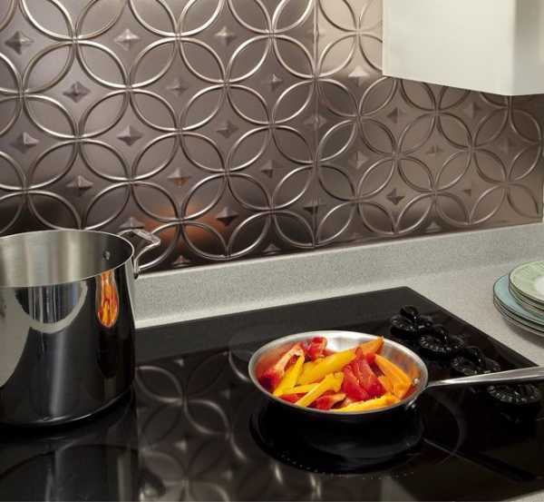 Металл хорошо сочетается с фасадами гарнитуров, выполненных в одном цвете. Широко используется в стиле лофт и хай-тек. В современных интерьерах очень часто можно встретить металлические элементы, поэтому нет ничего удивительного, что плиты из этого металла стали использовать и для обшивки стен на кухне.
