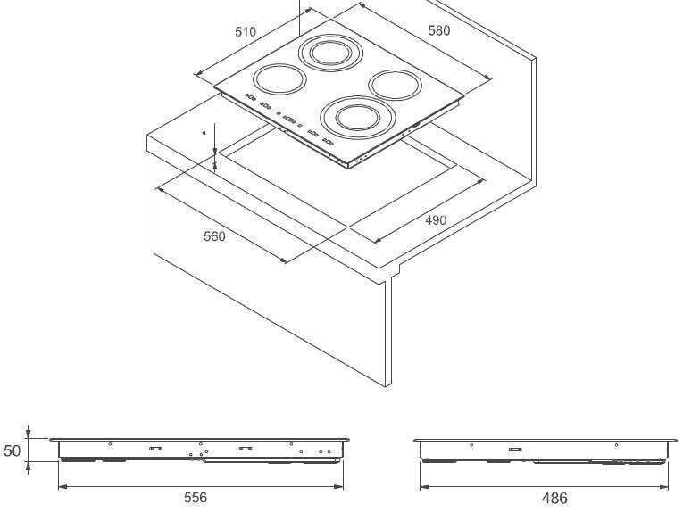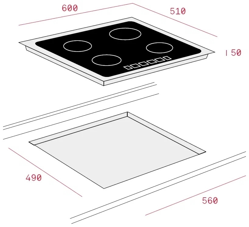 Электрические, в том числе индукционные устройства имеют наиболее разнообразный размерный ряд. Минимальная ширина встраиваемых домино от 19 см, независимые полноценные на 2 конфорки обычно от 30 см. В зависимости от числа конфорок, местоположения панели управления и глубины могут иметь габариты до 100 см и более, хотя наиболее популярные — стандартные квадратные (50×50, 55×55 см) и прямоугольные (60×55, 60×50 см). В высоту они меньше, чем газовые, но точно также имеют особые требования к толщине столешницы. Подробнее о них можно узнать из технической документации.