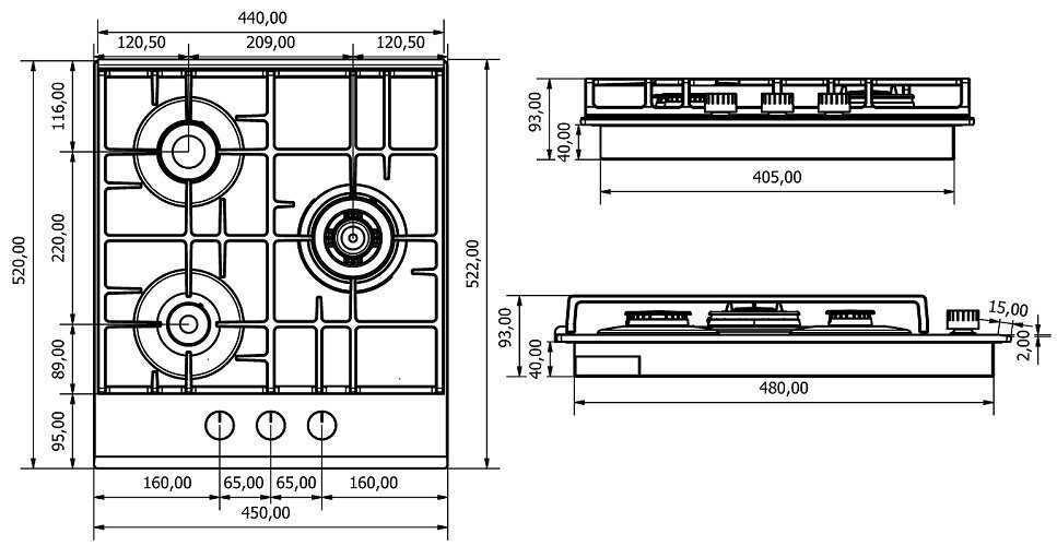 Для малогабаритных кухонь пользуются популярностью модели 45×40 см с 3 конфорками различной мощности, а также с функцией объединения зон либо расширением.