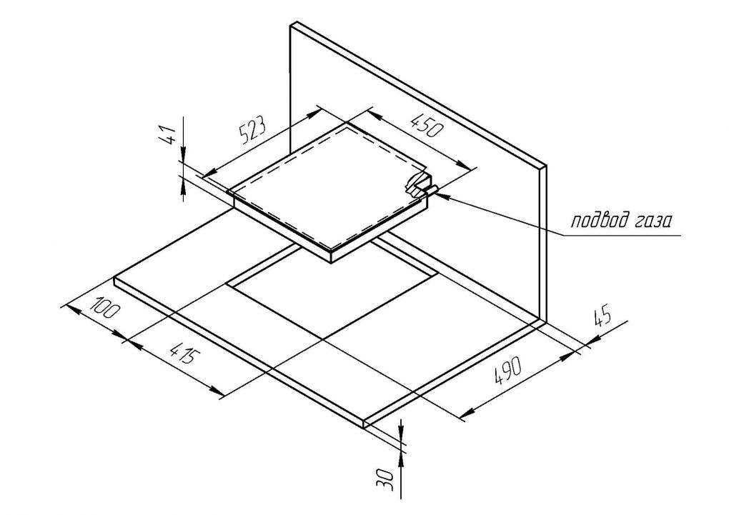Для стандартных панелей в столешнице вырезают пространство 56х49 см +/- 1-3 мм.