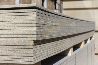 Сначала сложенные панели прессуются под давлением до 10 000 тонн со стальными листами в качестве промежуточных слоев, чтобы выпустить лишнюю воду.Таким образом, содержание воды в панелях снижается с 28 до 15 процентов, а плотность панели увеличивается. Цемент продолжает затвердевать в результате химической реакции с водой. Во время этого процесса выделяется тепло. Материал успевает гидратироваться и затвердеть. После трех недель схватывания содержание воды остается только на уровне от 7 до 8 процентов, и панели готовы к дальнейшей обработке. На первом этапе панели сушат в печи. В отличие от автоклавного фиброцемента, который отверждают паром в автоклавах, фиброцемент, высушенный на воздухе, менее пористый и легче обрабатывается.