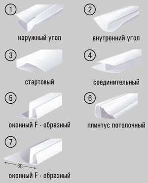 Виды профилейПроизводятся следующие виды профилей ПВХ, которые используются для монтажа подвесного потолка в коридоре, ванной, других комнатах: стартовый и F профиль используют для маскировки торцов, Н профиль позволяет наращивать длину, внешние, внутренние и универсальные углы в форме буквы Г применяют для стыковки материала в углах.