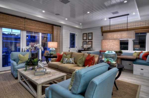 Уютная гостиная с отделкой потолка пластиковыми панелями