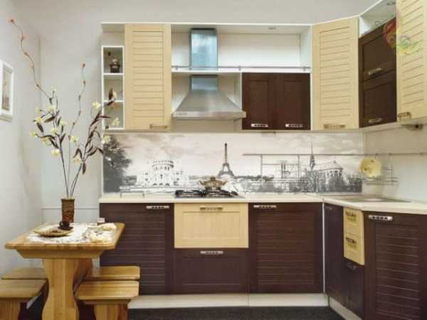 - Если кухня оформлена в стиле ретро, можно декорировать зону панелями с фотопечатью. Рабочая зона будет выглядеть как старинная парижская улочка. В таком стиле лучше декорировать полностью всю часть стены, включая пространство между шкафами.