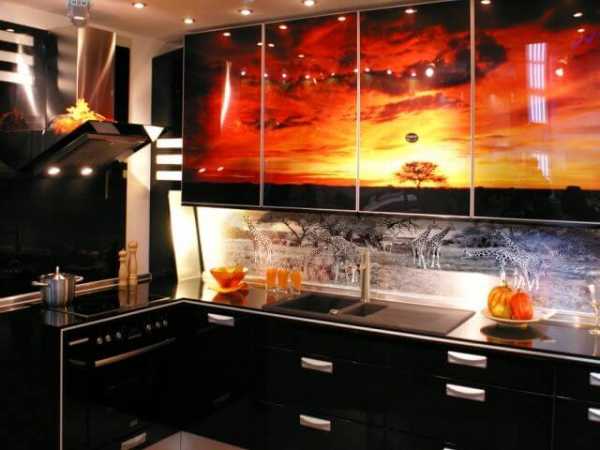 - Яркими и «сочными». Изображение на дверцах шкафов может быть с крупными цветами, аппетитными блюдами или привлекательными фруктами. При этом можно комбинировать разные рисунки – на одной части фасадов, которые примыкают к плите, мойке и столешнице, изображение может отсутствовать, а вот на дальних шкафчиках будут «плавать» рыбки или «расти» цветы. На фото ниже вы увидите несколько примеров таких фасадов. Выглядеть кухня будет по-разному.