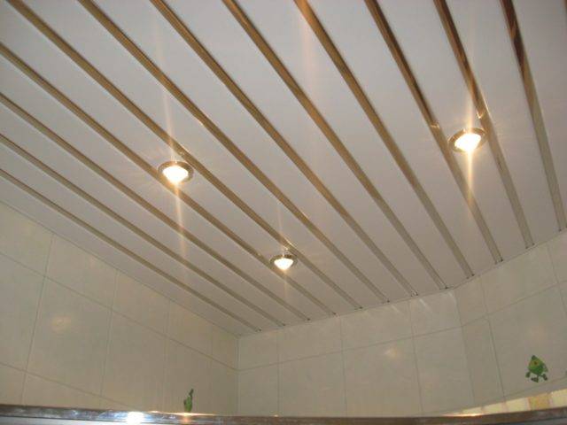 Ещё одна разновидность — панели, имитирующие реечный потолок. На поверхности расположены продольные канавки, разделяющие панель по длине (чаще встречаются двухсекционные или трёхсекционные). Между полосами могут располагаться тонкие вставки другого цвета (например, хромированные или имитирующие позолоту).