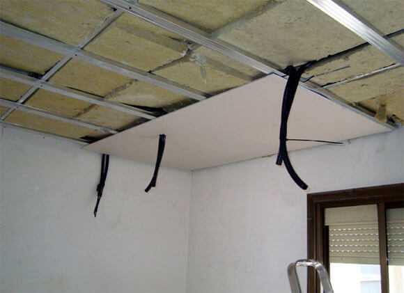 Самый распространенный способ – подвесные акустические потолки из гипсокартона. Этот материал и сам по себе является достаточно хорошим звукоизолятором, а если между ним и основным потолком дополнительно проложить слой другого шумопоглощающего материала, эффект будет ещё лучше.