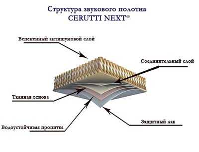 - Акустический натяжной потолок Черутти – это многослойное полотно, отличающееся повышенной прочностью, устойчивостью к повреждению, растяжению и воздействию влаги. Звукоизолирующие свойства ему придает слой вспененного полимера, нанесенный на обратную сторону.