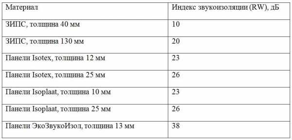 Для обозначения степени звукоизоляции используется специальный коэффициент RW, который измеряется в децибелах. Он показывает, какой уровень шума может отразить определенный материал. Ниже представлена таблица, где указан этот коэффициент для специальных звукоизоляционных панелей разных видов.