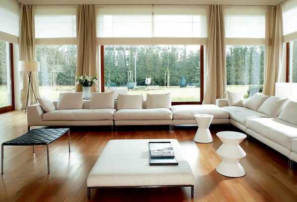 Мебель в гостиной с панорамными окнами расставлена по периметру комнатыИтак, шторы на панорамном окне ни в ком случае не должны испортить ощущение пространства и свободы в гостиной. Значит, не стоит отдавать предпочтение тяжелым и массивным тканям. Прозрачные легкие ткани, в такую гостиную тоже не подойдут, следовательно, искать нужно что-то среднее и в светлых тонах. Если гостиная оформлена в стиле минимализм, что чаще и бывает, ведь панорамное окно и характерно для этого стиля, то в таком случае можно украсить окно японскими шторами. Выглядят такие шторы очень стильно и напоминают жалюзи, основное их достоинство в том, что раскрыть окно можно нажав на кнопку пульта дистанционного управления.