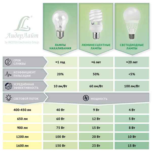 Раньше источники накаливания обеспечивали 12-14 Лм на Ватт, теперь эта величина составляет 80-190 Лм на Ватт. Эффективность зависит только от производителя, бывают: