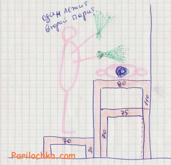 Оптимальный расчёт провести нетрудно. Для того чтобы лучше представить, какие размеры должны быть у парной, можно сделать чертёж на листе бумаги с использованием масштаба. На чертеже парилки разместить необходимые предметы и посмотреть, насколько комфортное помещение получается.