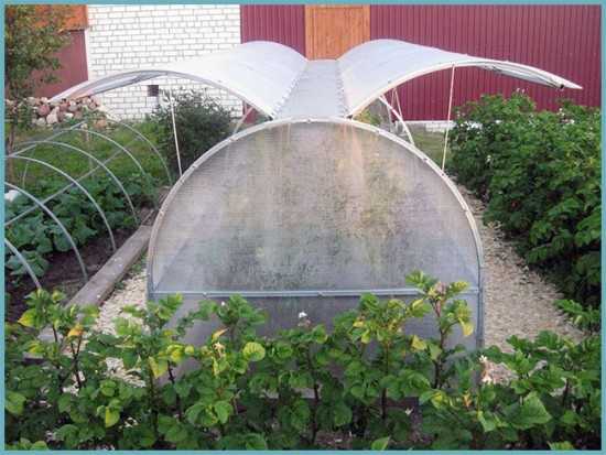 В качестве покрытия может быть использована обычная полиэтиленовая пленка толщиной 150 мкм, основным минусом которой является ее недолговечность. Более высокими качественными характеристиками обладает армированная пленка. Такое покрытие может защитить растения даже в областях с частыми сильными ветрами. Разница в цене между обычным и армированным типами пленки значительна, но срок эксплуатации последнего также на порядок выше.
