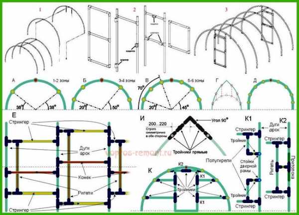 Как видите, особых сложностей еще нет, но они могут возникнуть при устройстве дверей и окон. Для этого от основания с двух сторон проводим вертикальные линии и делаем отметки на дуге. Для крепления используем косые тройники, хотя можно сделать это и при помощи деревянных реек, но в этом случае страдает внешний вид конструкции.