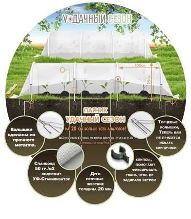 Плотность укрывного материала СУФ составляет 50 г\м. Пластиковые парниковые дуги уже вшиты в материал. Жесткие и прочные трубы ПВД, устойчивые к коррозии, диаметром 20 мм, легко гнутся и не ломаются. В комплект также входят колышки для установки в землю — 18 шт. Они сделаны из нержавеющего металла. Длина рабочей части 21 см, общая длина 34 см. Изделие комплектуется клипсами для крепления материала при поливе. В продажу парник с укрывным материалом “Удачный Сезон” поставляется в нескольких размерах. Вы можете купить изделие длиной 3, 4, 5, 6, 7 и метров.Вывод: действительно уникальное предложение, не имеющее аналогов. Отличная возможность облегчить свои заботу по уходу за овощными культурами.