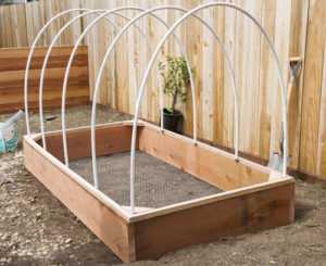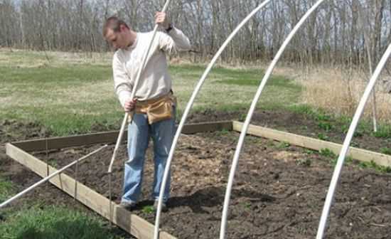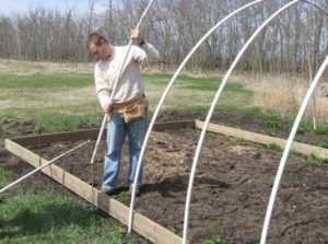Собственно делать тут особенно нечего. Пластиковые трубы без труда сгибаются руками, затем их останется только насадить на штыри из арматуры, вставленные в землю по бокам гряд.