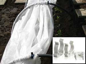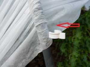 Для удобства использования можно применять клипсы для труб, ими закрепляется поднятый на нужную высоту спанбонд.