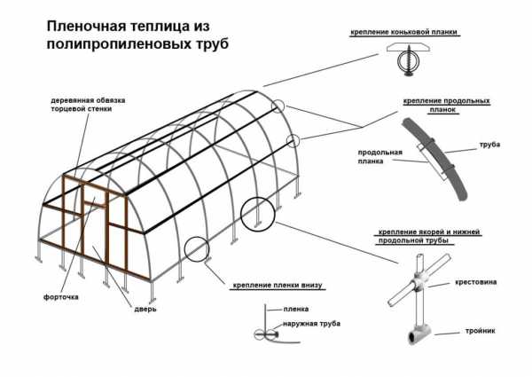 Парник, выполненный из пропиленовых или толстостенных шлангов, смастерить проще всего и наименее затратно. Остатки этого материала всегда есть у каждого рачительного хозяина. Очередность монтажа парника из пластиковых труб следующая: