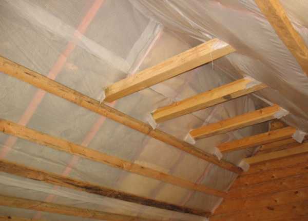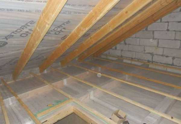 - По стропилам кровли снизу с тугим натяжением прибивают строительным степлером пароизоляционную пленку. Чтобы скобы не порвали материал, поверх креплений к каждому стропилу он прижимается рейкой, которую садят на саморезы (в случае деревянной конструкции).