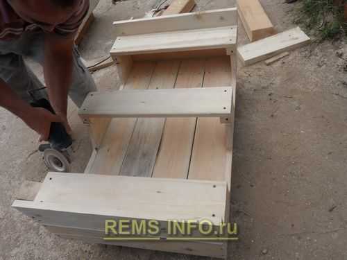 Делаем поддон, ставим борта с выпиленными отверстиями, крепим бруски под сидения, присоединяем спинку.
