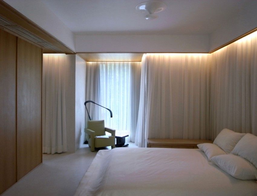 В результате подобной конструкции создается визуальное впечатление отсутствия карниза. А гардинная ткань свободно ниспадает с потолка, словно зависая в воздухе.