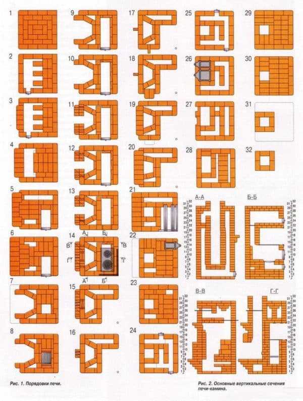 - По схемам порядовок надо складывать кирпич. Участки, расположенные рядом с огнем, делают из шамотного кирпича.