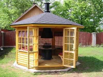 - И не забудьте об устройстве качественного дымохода, чаще всего его делают трапециевидной формы, высота должна быть больше, чем уровень конька крыши – в этом случае у вас всегда будет хорошая тяга, и дым не будет уходить в беседку.