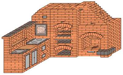 Компьютерный 3D проект печи для беседки, которую можно построить без металлических закладных, дан на рис. Ее же можно строить и со сталью, если боитесь висячих кирпичей или воспользуетесь гораздо более дешевым глиняно-цементным или известково-цементным печным раствором для уличных печей. В таком случае висячие края кирпичей должны опираться на закладные из уголка или 6-мм проволоки-катанки аналогично порядовке печи-мангала, см. выше. Материал – обычный печной кирпич, а для рядов до 6-го включительно даже рабочий пустотелый.