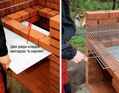 На 70 см. от пола в боковых стенках выдвигаются кирпичи, на которые потом ставится поддон для горения угля и дров. На уровне от 10 до 25 см от кирпичных выступов сбоку устанавливаются направляющие. Благодаря им вы сможете изменять наклон и положение решетки для продуктов, и выбирать подходящую температуру.