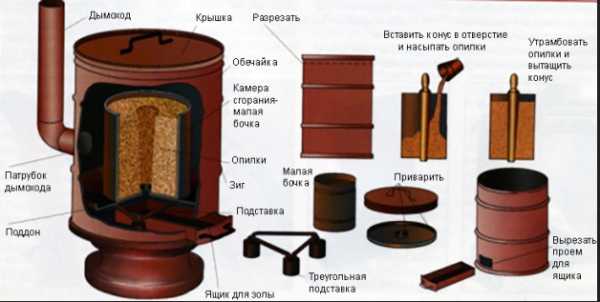 Отопительный прибор, выполненный своими руками, предназначенный для отопления подсобных помещений, выполнен из двухсотлитровой металлической бочки. Печка работает на опилках, стружке и других отходах деревообработки. Внутри большой бочки на подставке установлена малая бочка для загрузки топлива. Под ней зольник — выдвижной ящик из листового металла.