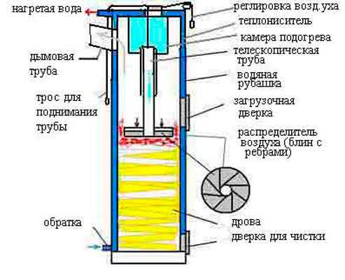 В центре диска установлена телескопическая полая труба, через которую поступает воздух прямо в камеру сгорания, где благодаря наваренным на диск ребрам равномерно распределяет его по всей поверхности дров. Он опускается самостоятельно, по мере прогорания топлива. Поднять его перед загрузкой можно с помощью троса.