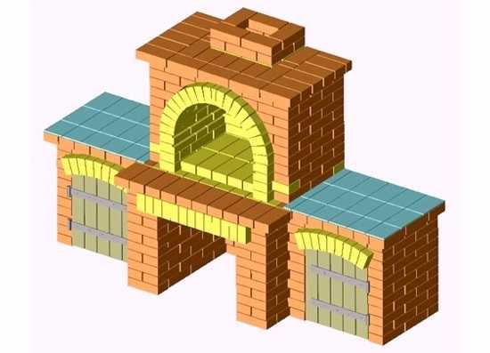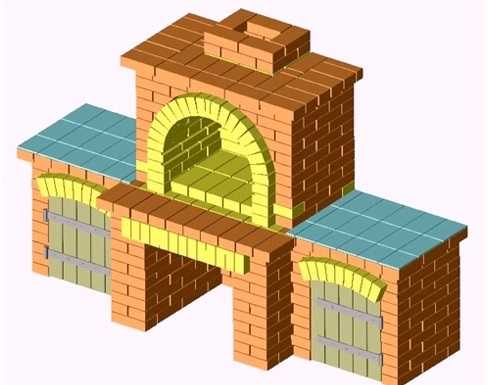 Таким образом, главное — в точности следовать чертежам. Сначала из кирпичей выкладывают цоколь, затем делают стенки жаровен, мангала, коптильной камеры и, наконец, сооружают дымоход. Когда кладка завершена, устанавливают металлические дверцы, крепления для шампуров, варочную поверхность и другие элементы.