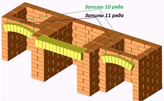 В десятом ряду опять делаем запилы на отдельных элементах. Располагаются они в тех же местах, но уже ориентированы вниз, повторяя изгиб арочных перекрытий. Одиннадцатый ряд печки уже перекрывает арки, и кирпичи, идущие над ними, также выпиливаются. На рисунке запилы 10 и 11 ряда отмечены разным цветом.