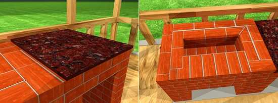 Печка готова, осталось только отделать столешницу и навесить дверцы к нишам. Столешницу выкладываем кафелем, либо заказываем уже готовое покрытие, из искусственного или натурального камня. То же и дверцы – могут быть самодельными или заказными.
