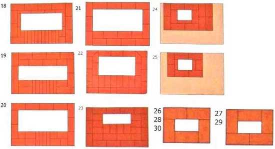 Таким же образом выкладываем 21-й, 22-й, 23-й и 24-й ряды: в каждом из них делаем выпуск боковых шамотных кирпичей на 1/4. Двадцать четвертый ряд должен идти с выпуском на 1/4 вперед и по боковым сторонам. Отверстие в нем становится размером с обыкновенный кирпич.