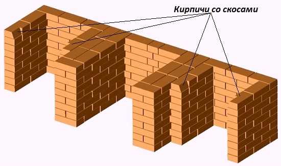 Девятый ряд печки выкладывается почти так же, как и все предыдущие. Исключение составляют крайние кирпичи боковых ниш. На каждом из них делаем спил до 30 градусов, на половину длины кирпича. Это нужно для последующего формирования арочных перекрытий над нишами печки. Как ориентированы спилы, и где находятся кирпичи с ними – вы можете рассмотреть на следующем рисунке.