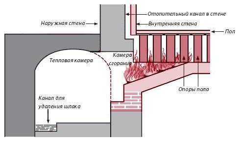 Основной конструктивный элемент – теплообменник или змеевик, устанавливаемый в топливник и через который производится подключение всей водяной отопительной системы. В печном устройстве выкладывают каналы для прохода теплообменника – водогрейный контур.