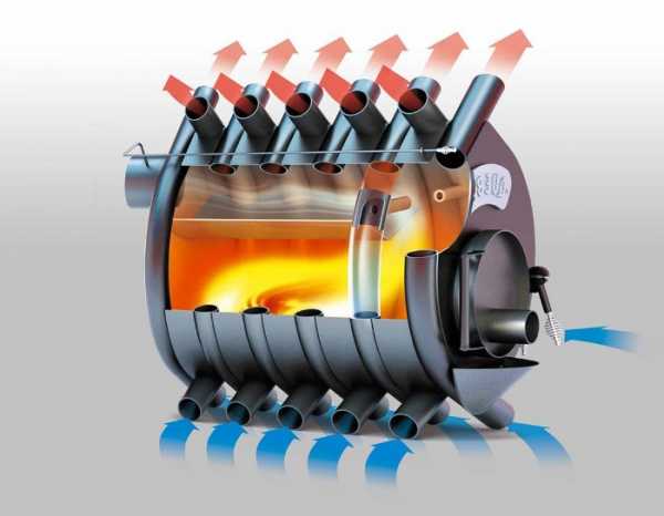В основе конструкции цилиндр из стали толщиной до 5-6 мм, который формирует стенки топочной. Цилиндр положен набок и дверь топочной располагается на одной из торцевых граней. Вокруг корпуса привариваются полые трубы круглого или прямоугольного сечения. Нагреваясь от топки, в трубах прогревается и воздух, так что поддерживается активный конвекционный процесс.