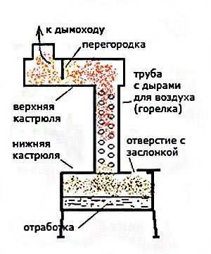 После этого газы поступают в верхнюю камеру, в которой они догорают, а отработанные продукты и дым выходят через дымоход. Как работает печь, наглядно продемонстрирует видео.