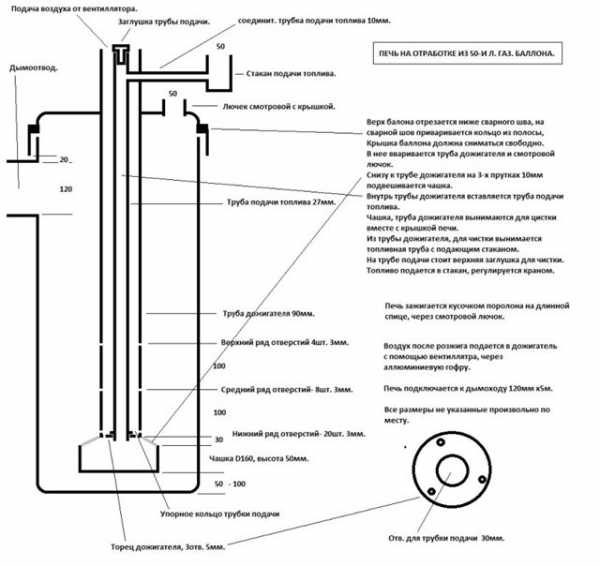 Для подачи воздуха в печь из баллона не требуется турбо-горелка, ведь топливо поступает самотеком. Ниже представлен чертеж конструкции из баллона.