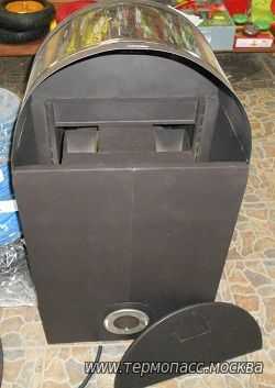 - В корпусе устройства присутствует встроенная топка, в которую закладываются дрова. Особенность топочной конструкции заключается в том, что приток воздуха сюда является очень малым. Для этого топка имеет плотную дверку, закрывающуюся герметично, а также приточно-вытяжной вентилятор.