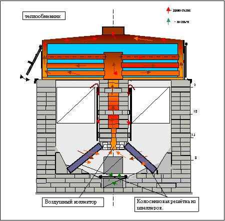Корпус будущего нагревательного прибора выполняется с применением керамического кирпича. Для создания перегородок внутри конструкции используется шамотный материал. Разделяющие стенки между топкой и камерой сгорания газа должны быть выполнены из жаропрочной стали достаточной толщины. Не следует забывать об организации эффективных процессов тяги и подачи необходимого для течения реакции потока воздуха.