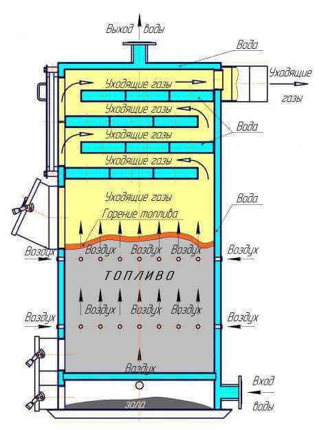 - Все эти процессы нагревают воду, которая находится в специальном отделе и она отправляется по трубопроводу через всю систему отопления, попутно охлаждая систему печи.